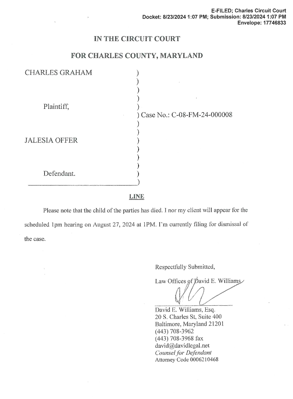 In a document filed in court on August 25th, Offer's attorney, David Williams, informs the judge, "Please note that the child of the parties has died. I nor my client will appear for the scheduled 1pm hearing on August 27 [...] I'm currently filing for dismissal of the case."