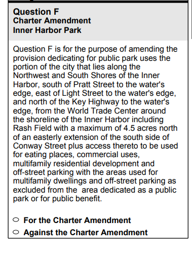 The "Inner Harbor Park" Charter Amendment reads as follows on the proof ballot available on the Maryland State Board of Elections website: