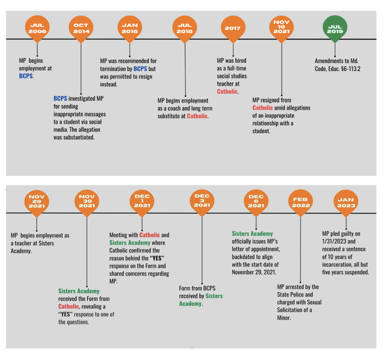 In 2016, he was hired as a coach and teacher at The Catholic High School in Baltimore. Despite conducting a criminal history check, as well as receiving personal and professional references, school administrators were never made aware of the BCPS investigation conducted a year prior.