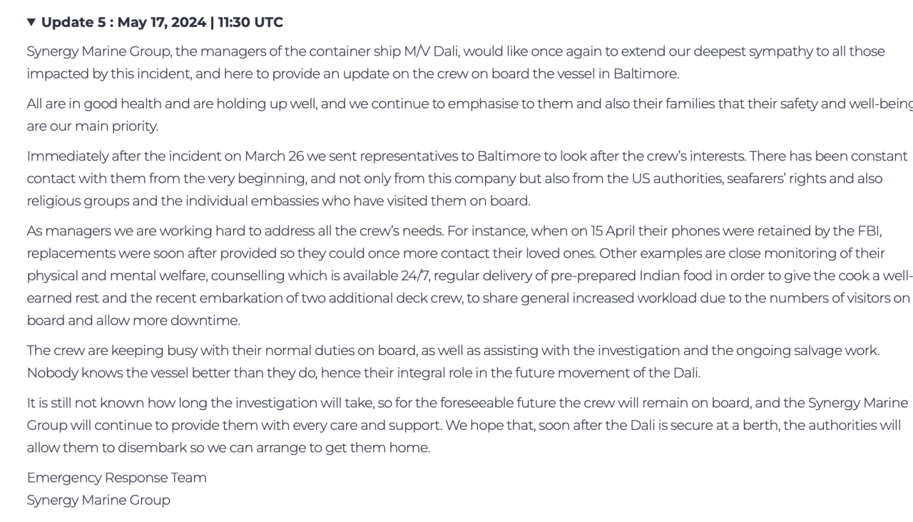 "It was hard to assess what they needed when they were out in the river, especially once communication became very limited," Middleton said of the Dali's crew.