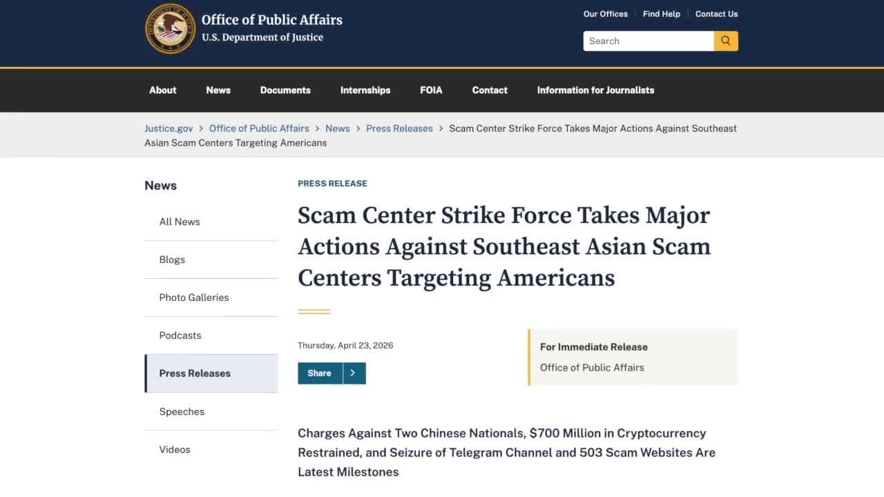 Just last week, the Scam Center Strike Force took action against Southeast Asian scam centers, seizing 500 fake investment websites and restraining more than $700 million in stolen cryptocurrency.
