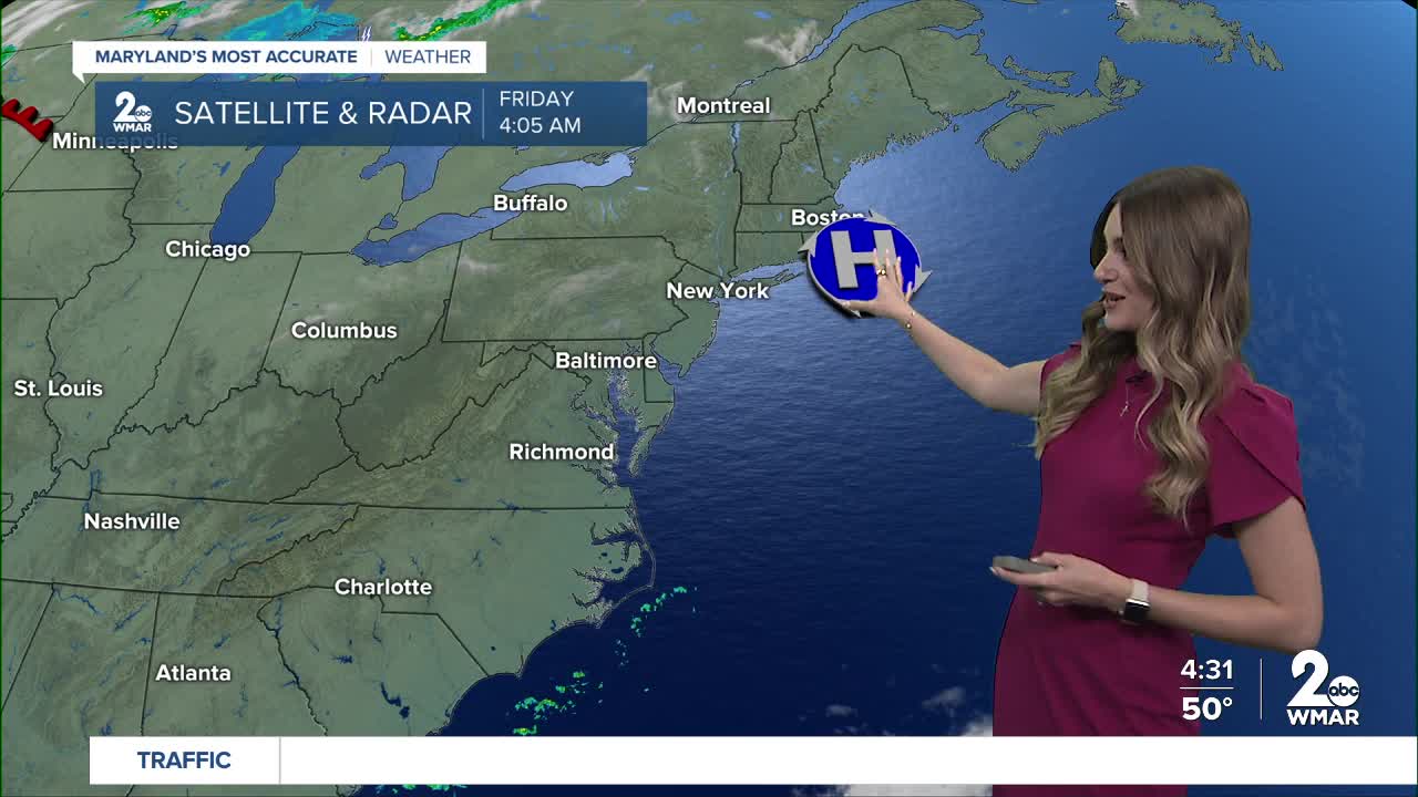 BALTIMORE — Happy Friday! Mostly sunny skies today with highs in the low-70s! High pressure moves offshore this weekend, allowing southerly winds to warm us up on Saturday and Sunday, with highs in the mid to upper-70s! Temperatures continue to climb near 80° into early next week. The next best chance for rain occurs on Wednesday.
