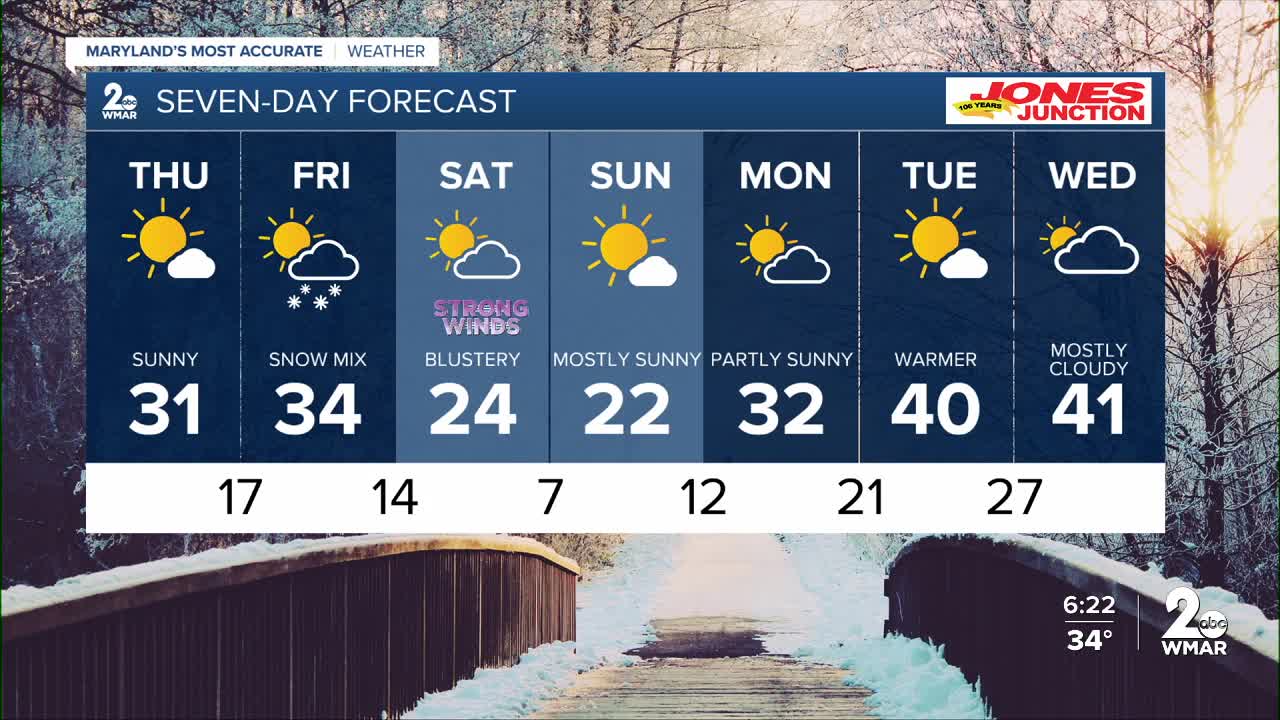 BALTIMORE — Happy Thursday! A bright and sun-filled day is upon us with highs in the low-30s. A fast-moving clipper system will slide in Friday afternoon, bringing a chance for light snow showers between 1 - 9 PM. Snow accumulations will be minimal, around a dusting up to an inch. The weekend looks sunny and dry but much colder as another blast of Arctic air moves in. Winds will be very strong on Saturday, with occasional gusts reaching 40–50 mph.