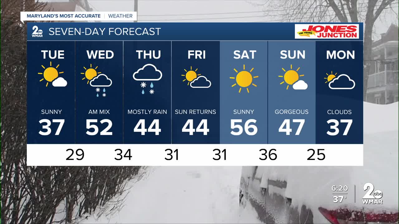 BALTIMORE — Happy Tuesday! Sunshine returns today with a noticeable breeze. A few rain and snow showers are possible tonight. Much needed beneficial rain returns on Thursday. Drier skies are expected this weekend with highs in the 40s and 50s!