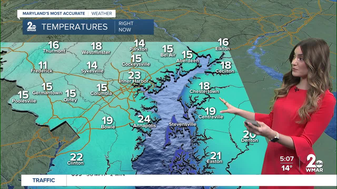 BALTIMORE — Happy Tuesday! Winds will be less breezy today. Despite all the sunshine, temperatures will still remain below normal, with highs in the mid-30s. Temperatures will trend milder through the rest of the week, and the 50s come back in style on Thursday and Friday! A cold front will bring gusty rain showers to the area Thursday evening into Friday morning. Drier skies are expected this weekend.