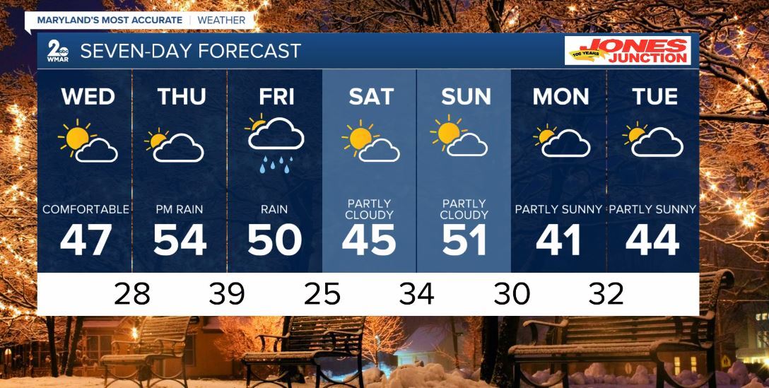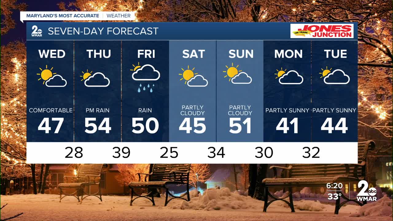 Winds will be less breezy today. Despite all the sunshine, temperatures will still remain below normal, with highs in the mid-30s. Temperatures will trend milder through the rest of the week, and the 50s come back in style on Thursday and Friday! A cold front will bring gusty rain showers to the area Thursday evening into Friday morning. Drier skies are expected this weekend.