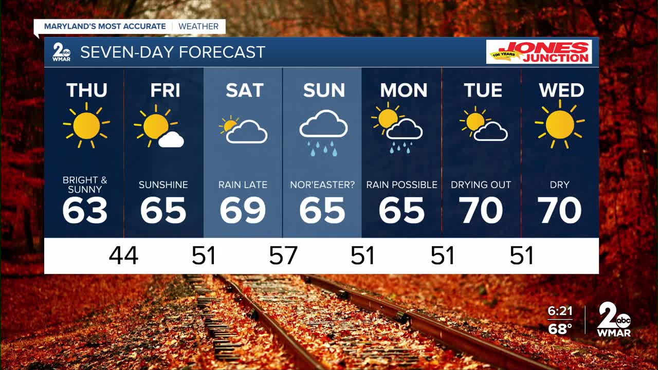 BALTIMORE — Happy Thursday! Grab the thicker jacket because temperatures start off in the 40s and low-50s over the next few mornings. Temperatures will rise into the mid-60s through Friday with ample sunshine! A coastal storm off the southeast coast of the US tracks northward this weekend. The exact placement of the storm is still uncertain. A track farther east will keep us dry, and a track farther west will mean wind and rain for the Mid-Atlantic. The timing would mostly likely be late Saturday night through Monday morning. Drier skies heading into the middle of next week with highs in the low-70s.