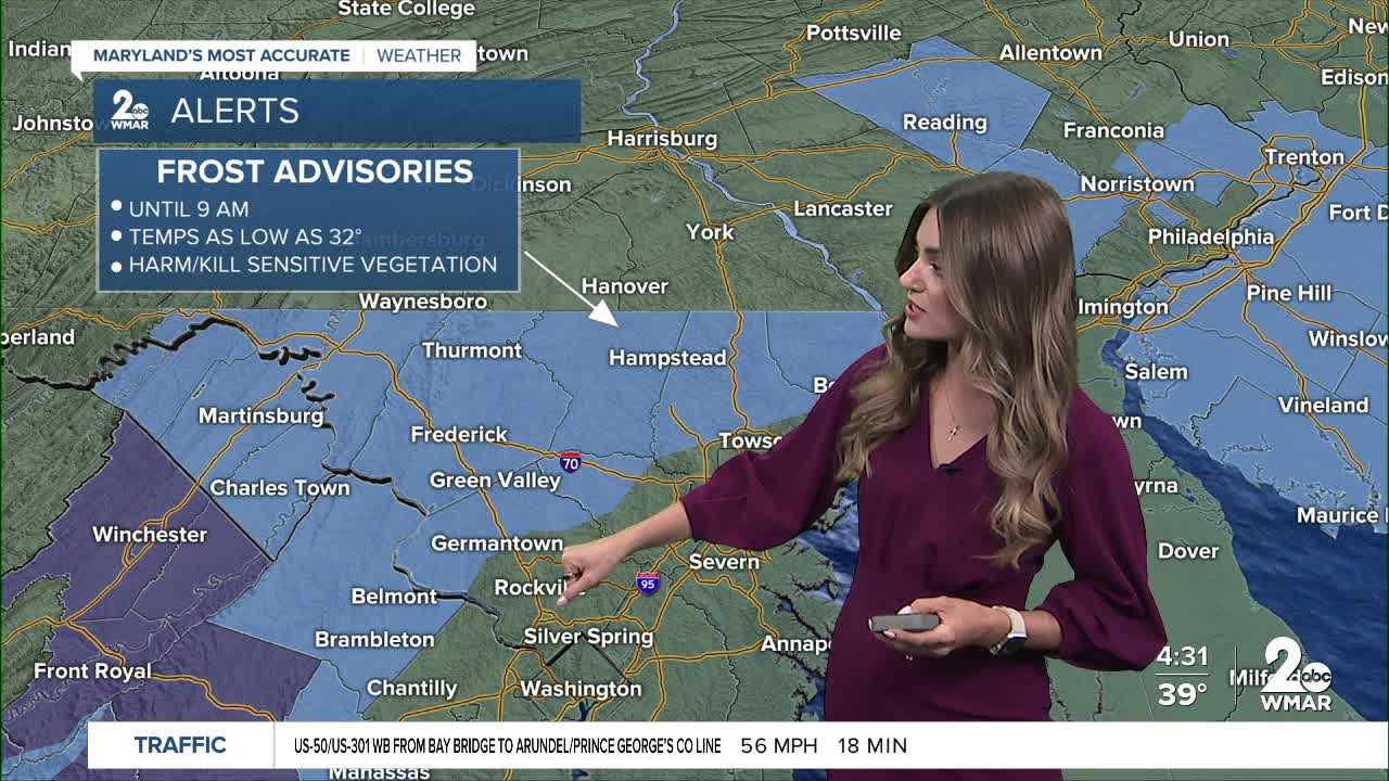 BALTIMORE — Happy Friday! Plenty of sunshine today with highs in the upper-50s and low-60s. Staying dry throughout the weekend with chilly morning temperatures in the 40s, and afternoon highs in the low-60s. The pattern remains quiet through Monday, before shower chances increase heading into the middle of next week!