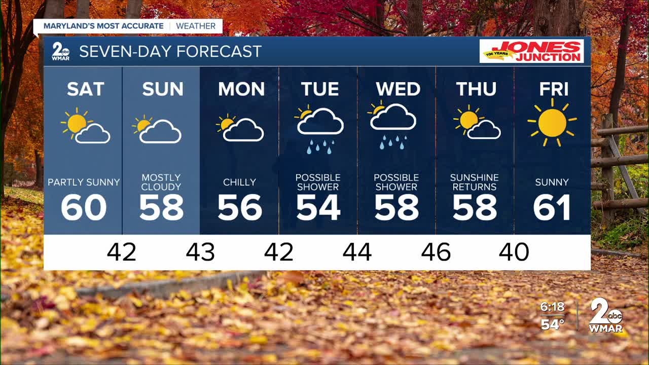 Plenty of sunshine today with highs in the upper-50s and low-60s. Freeze warnings have been issued for northern Maryland counties for Saturday morning through 9 A.M.. Staying dry throughout the weekend with chilly morning temperatures in the 40s, and afternoon highs in the low-60s. The pattern remains quiet through Monday, before shower chances increase heading into the middle of next week!