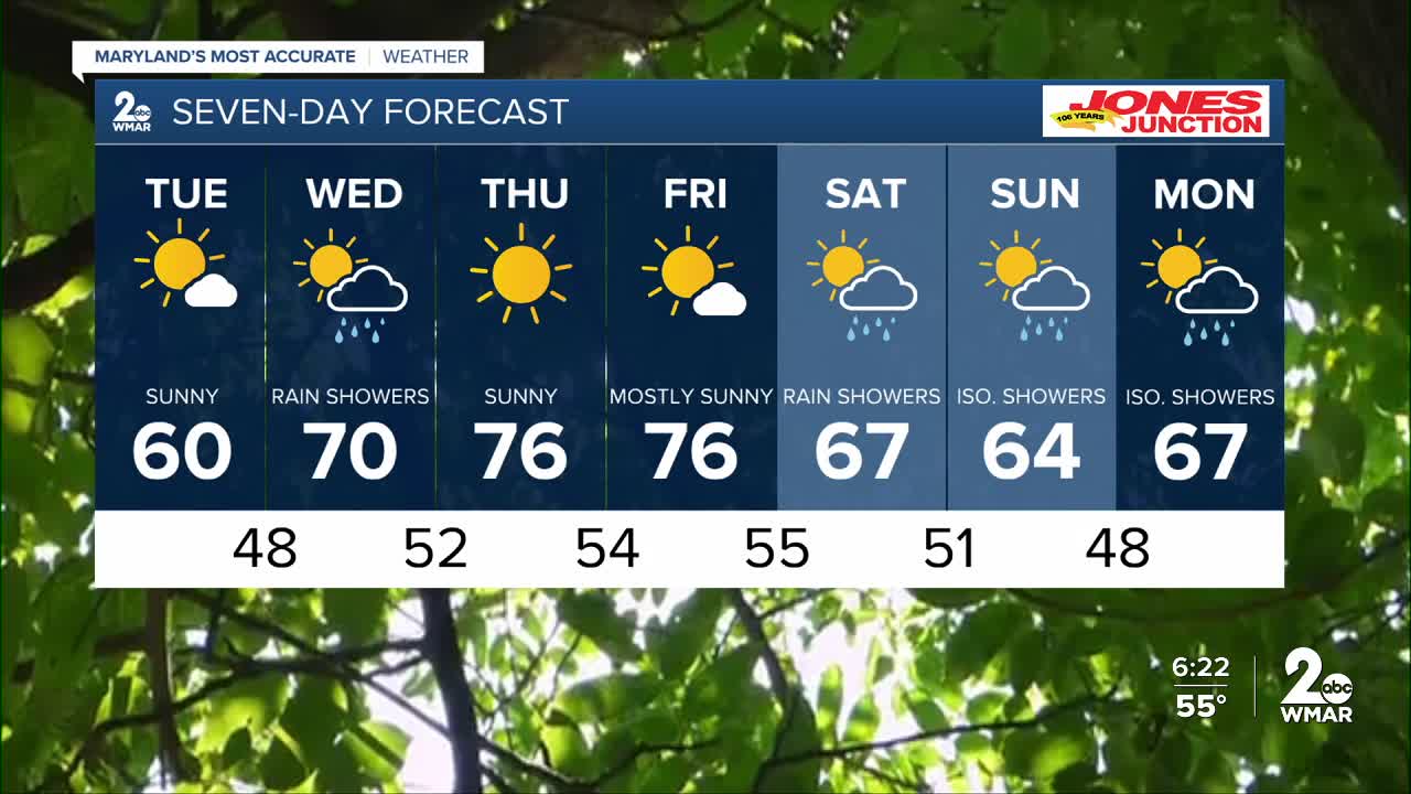 BALTIMORE — Happy Tuesday! Freeze Warnings are in effect until 10 AM, so make sure to cover sensitive plants/crops! The sun returns with high temperatures near 60°! Spotty showers are possible on Wednesday with temperatures rising back into the low-70s. Mid to upper-70s late-week with an evening rain chance on Friday. The weekend is trending wet with a series of disturbances set to move through the area!