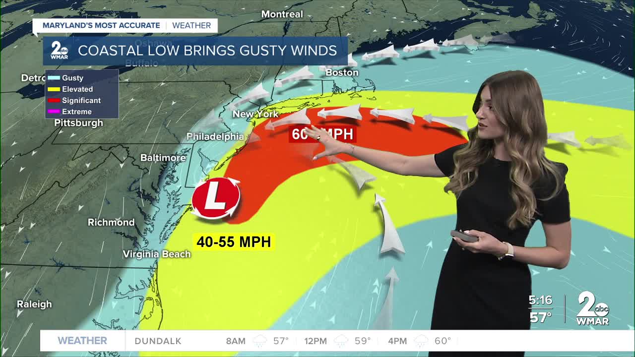 BALTIMORE — Happy Monday! It will be a cloudy and windy start to the week, with noticeable wind gusts up to 30-35 mph at times. Patchy drizzle will linger throughout the day with temperatures staying below average, in the low-60s. Gradual clearing is expected on Tuesday as the coastal low moves away from the Mid-Atlantic region. More sunshine is expected on Wednesday with seasonal temperatures. Readings trend cooler late-week, but the sun sticks around! Temperatures will warm up into the low to mid-70s this weekend.