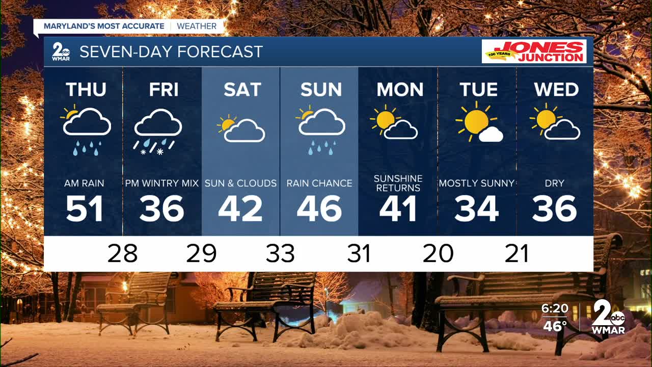 It will feel breezy this morning with wind gusts around 25-30 mph before they relax later today. Sunshine returns. Temperatures will trend milder, with highs near 50°. Christmas Day will be mild with highs in the low-50s, clouds will be plentiful, and a few spotty showers are possible, mostly to our southwest. Travel may be difficult on Friday afternoon/evening as a wintry mix of snow, sleet, and freezing rain is possible. This could lead to icy roads and sidewalks. Conditions clear out heading into Saturday before showers return on Sunday.
