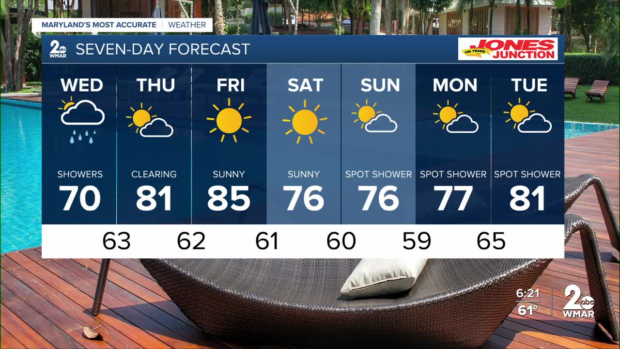 BALTIMORE — We had some very beneficial rainfall today, and there's more on the way Wednesday. Tomorrow will be similar to today, meaning you can expect clouds, showers, and cool temperatures. It'll be windy Wednesday morning, but the winds gradually calm down by the later half of the day, as our low pressure system begins to weaken. Additional rainfall will be around a quarter to a half inch on Wednesday. The weather warms up significantly by Thursday as we return to the 80s, and eventually hit the mid 80s by Friday! High pressure will deliver sunshine and warm temps for the upcoming weekend!