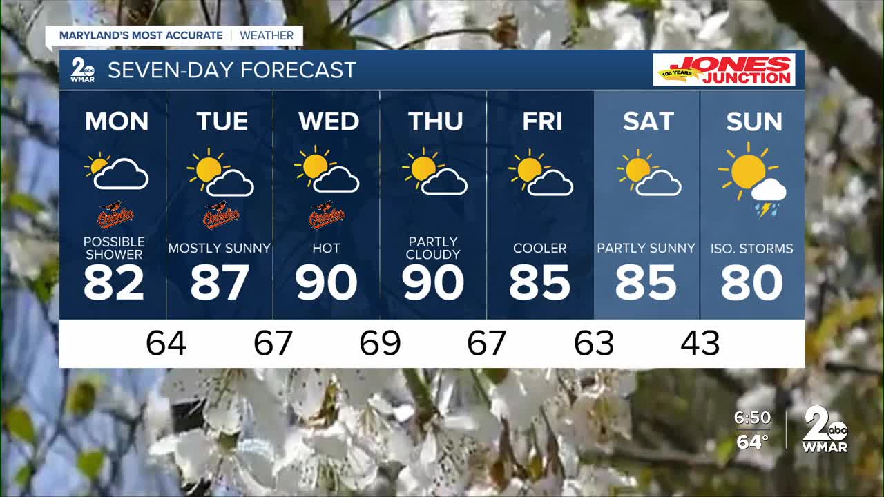 Happy Monday! A warm start to the week with highs in the low-80s! Skies will stay mostly dry with just a slight chance of an afternoon pop-up. Breezy southwest winds and dry fuels will promote elevated the chance for rapid wildfire spread, so hold off on burning outdoors today. Nearing record warmth mid-week with high temperatures rising near 90°!