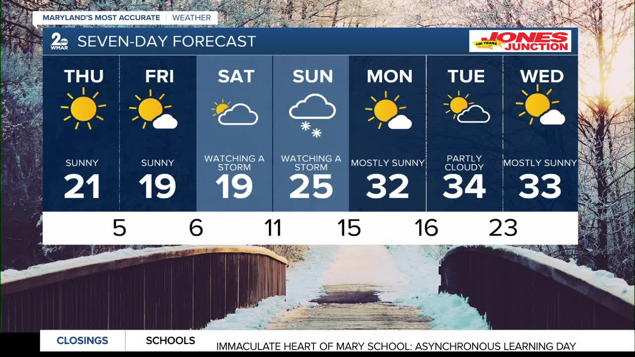 BALTIMORE — Happy Thursday! The brutal cold sticks around through the rest of the week and into the weekend. Temperatures will remain below freezing with sub-zero wind chills during the overnight hours. Regarding the potential winter storm this weekend, most of the computer models skirt the system out to sea, lowering the chance to see snow here in Baltimore. However, Delmarva will experience strong winds and snow showers, so avoid traveling along the eastern shore if you can.