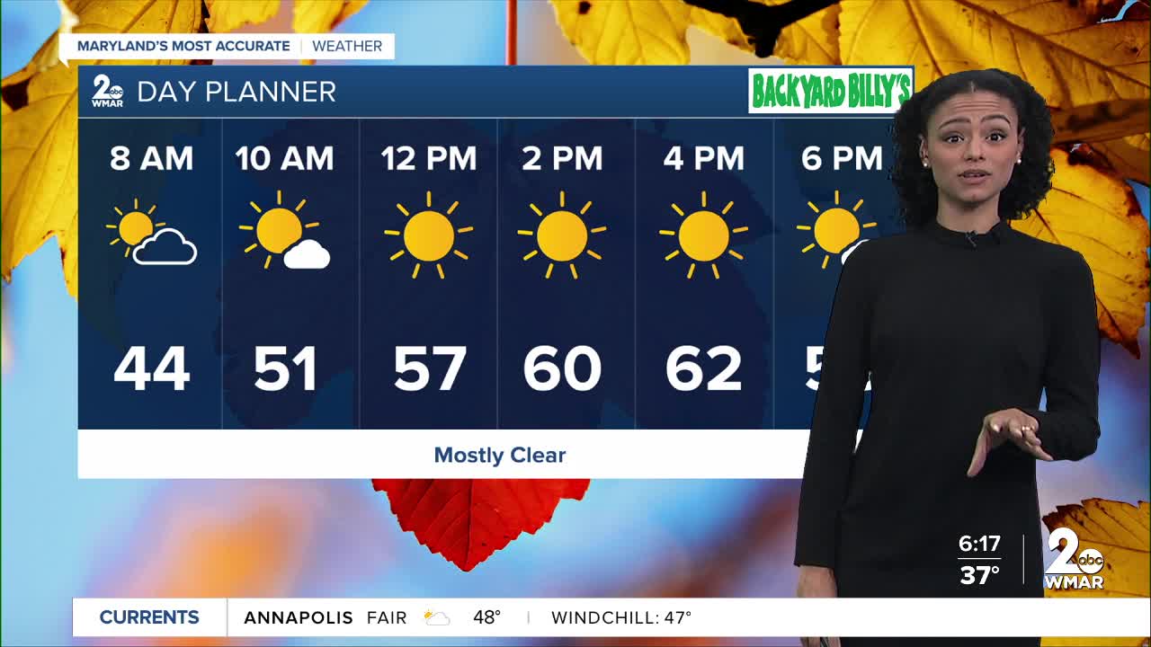 Easy start to the morning hours with mostly clear skies and a bit of a chill to the air. The chill will linger into the afternoon, with below-normal temperatures expected to stick around for highs. Things start to change Tuesday evening, with a slight chance of rain overnight into Wednesday. Off and on showers continue into the ending portions of the workweek. Halloween, so far, is one of our dry days, but the trade-off off are winds.