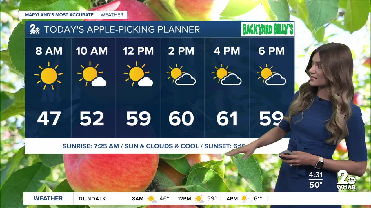 BALTIMORE — Happy Thursday! Partly cloudy skies today with highs in the low-60s. A dry stretch of weather is expected through the rest of the week into the weekend, with consistent temperatures in the low-60s. There will be an additional chill in the air on Friday and Saturday mornings, with wake up temperatures in the upper-30s and low-40s. Cooling down into next week with below average temperatures, in the mid to upper-50s!