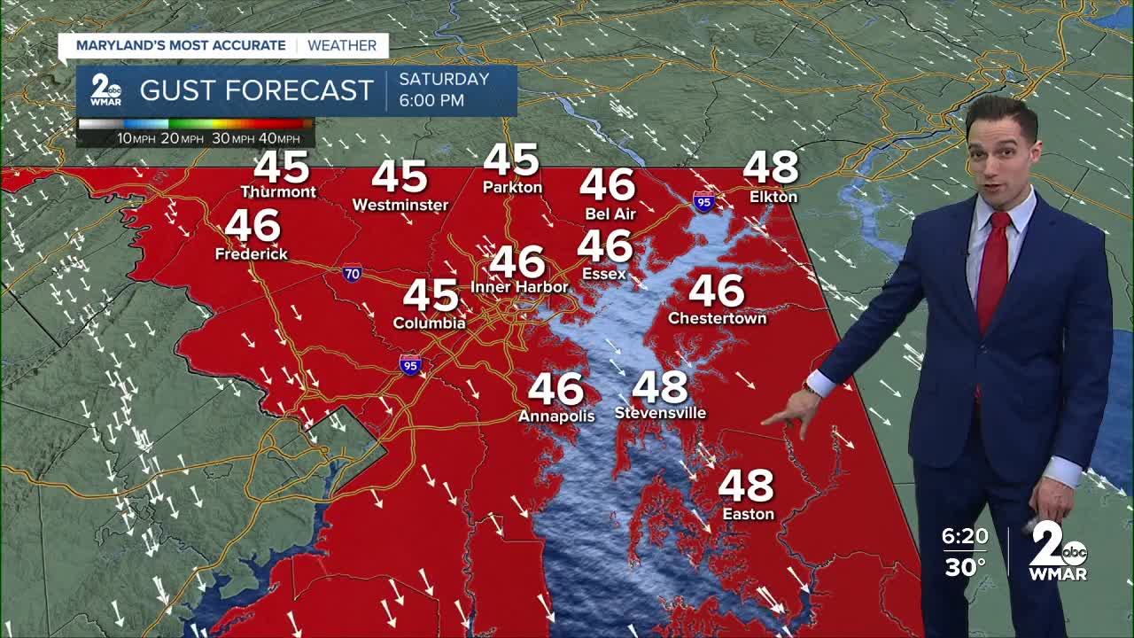 BALTIMORE — Happy Friday! Light snow is possible around mid-afternoon through midnight. Little to no snowfall accumulation is expected. Dangerously cold air slides in this weekend, keeping temperatures well below freezing with wind chills at or below 0° on Saturday. Extreme Cold Warnings go into effect from 4 AM Saturday through 10 AM Sunday. High Wind Warnings go into effect for the area from 4 AM - 7 PM Saturday, where gusts could top 50 mph at times and 60 mph across the higher elevations. This may result in downed trees and isolated power outages. Temperatures rebound into the 40s by the middle of next week!