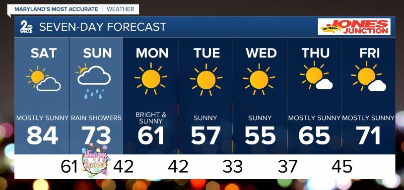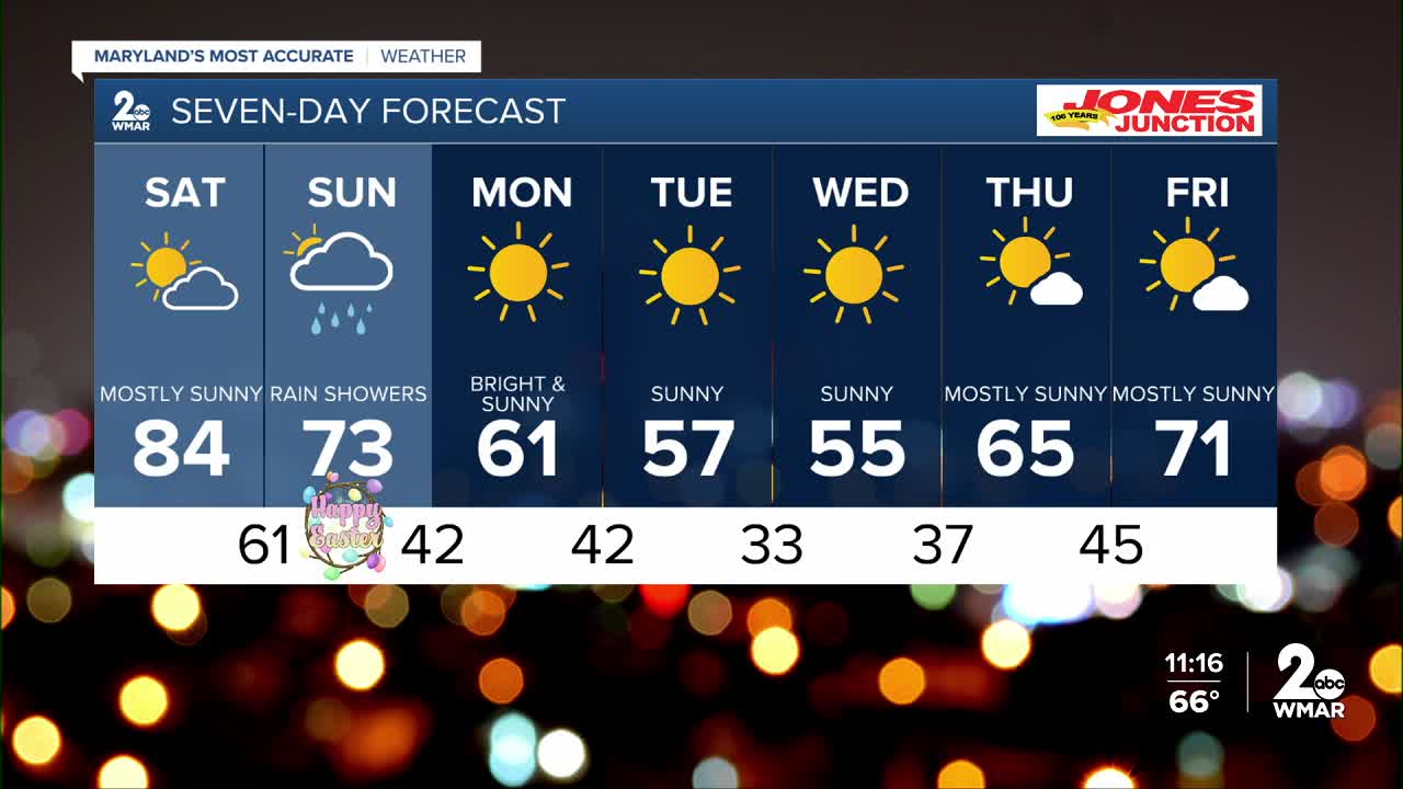 Mild rest of the evening with a few showers possible to the north. Mostly dry on Saturday with breezy southerly winds. Widespread rain showers are still expected to slide through on Easter Sunda, late morning through the afternoon. Temperatures will return to seasonal levels early next week with more sunshine!