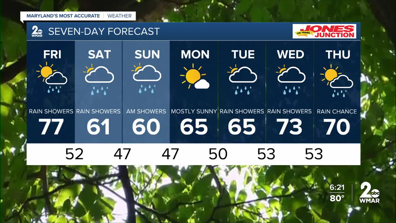 BALTIMORE — Happy Friday! Temperatures will trend above normal today, with highs in the mid to upper-70s! Showers and storms develop during the afternoon and evening hours. Scattered showers on Saturday with a few lingering showers on Sunday. On a side note, gusty winds will accompany the front this weekend, with gusts up to 30 mph at times!