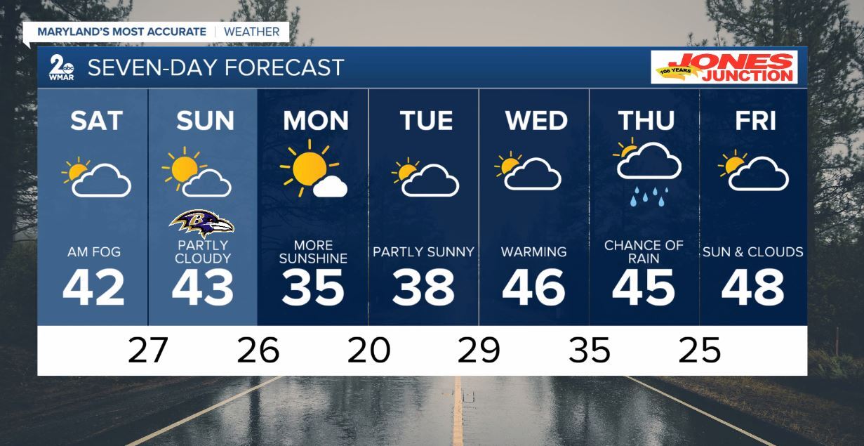 Thursday A chance of rain. Partly sunny, with a high near 45.