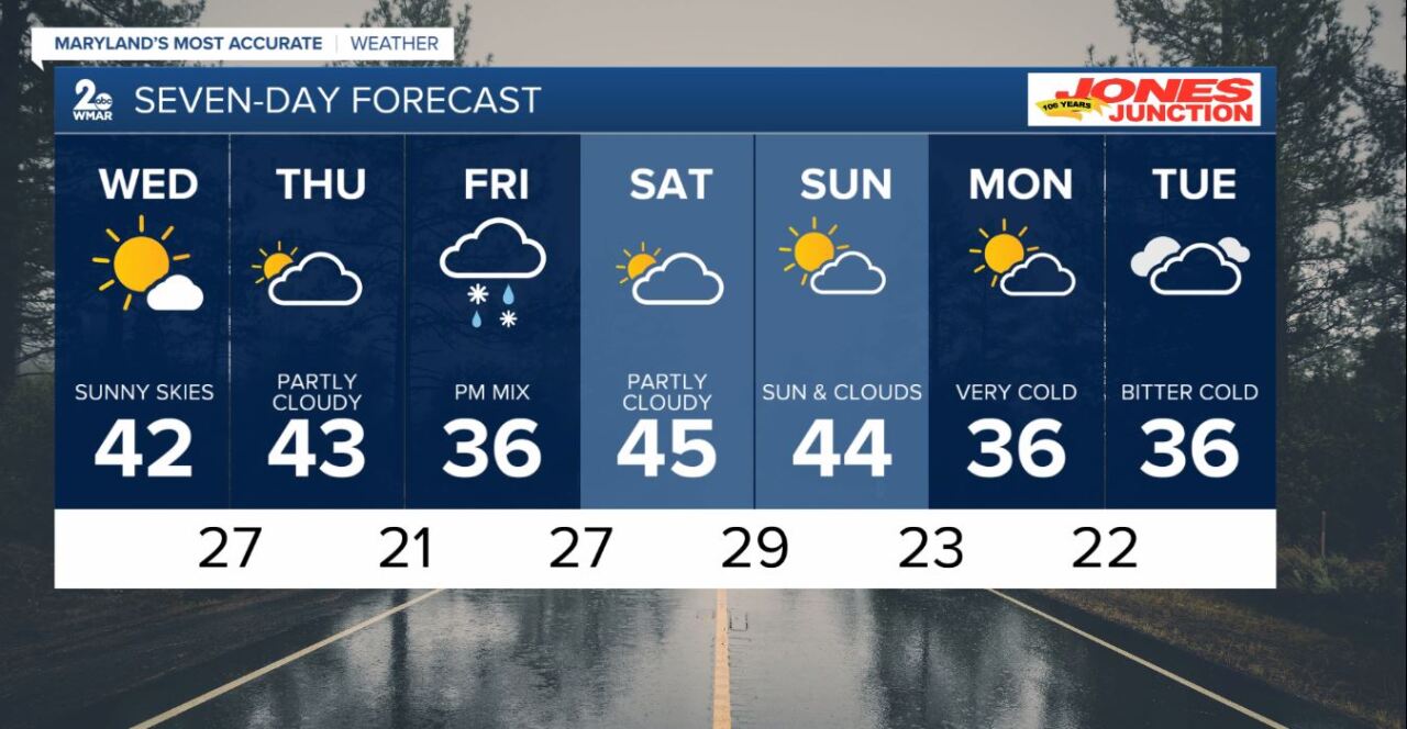 We’re also monitoring a coastal storm expected to develop Friday afternoon, which looks like our next meaningful chance for precipitation. With plenty of cold air in place, this system has a much better shot at producing wintry weather. That said, confidence in the storm track remains low. Most models currently slide it far enough south to miss us entirely, while a few brush the southern tier of Maryland.