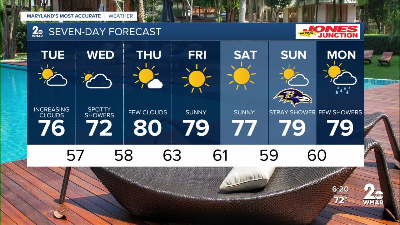 Tuesday begins Sunny, however, clouds increase through the afternoon as a system will be close to us offshore. We stay dry on Tuesday (and much of Wednesday for that matter!). There will be a slight chance of a spot shower or two near the Delmarva Peninsula Wednesday.