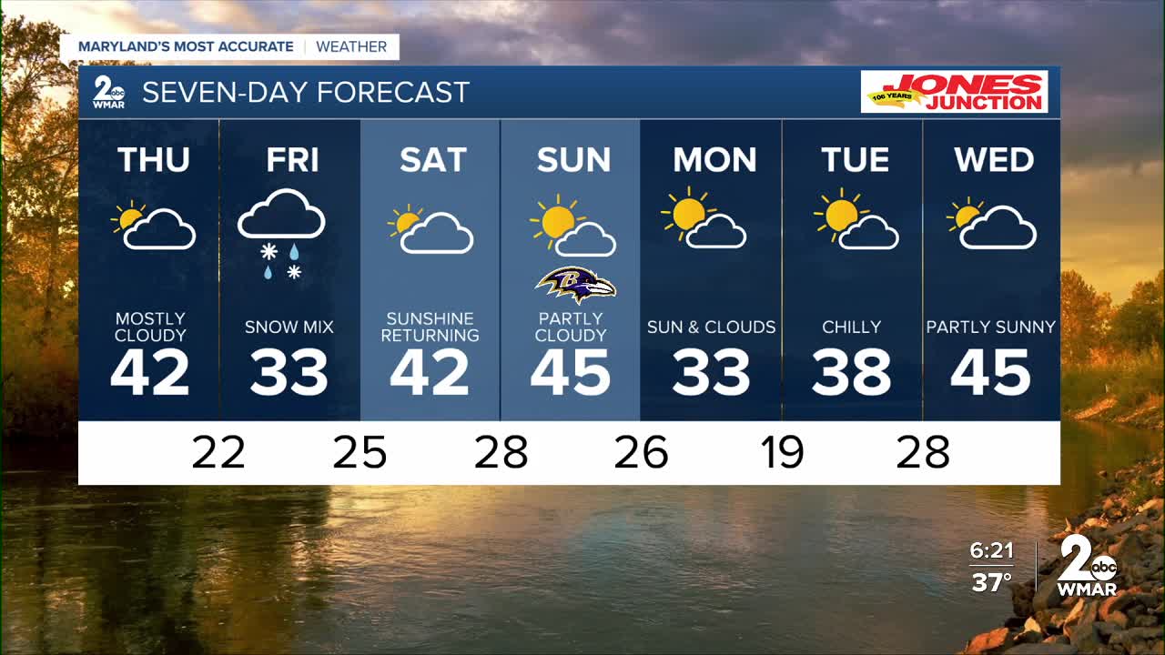 BALTIMORE — Happy Thursday! More clouds today with highs in the low-40s. A noticeable breeze will make it feel like the mid-30s this afternoon, so dress warm! Tonight into Friday morning could potentially be the coldest air of the season thus far, with temperatures plummeting into the low-20s with single digit wind chills for some. There is still some uncertainty with the exact track of Friday's storm system. There will be plenty of cold air in place to support snowfall, but the big question is whether we’ll have enough moisture moving northward. A northerly track could bring 1–2 inches of snow, while a more southerly path could leave us with nothing at all. Drier this weekend with highs in the low to mid-40s. Trending colder early next week!