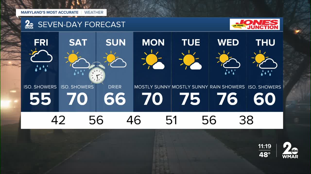 BALTIMORE — Happy Friday! Lingering clouds today with isolated showers possible. Temperatures should rise near average, in the low-50s. A few showers are possible Saturday evening as a front approaches. Most of the showers on Sunday look to stay to the south of the city. Starting next week off on the right note with sunny skies and early-May vibes! Highs will rise into the low to mid-70s through mid-week.