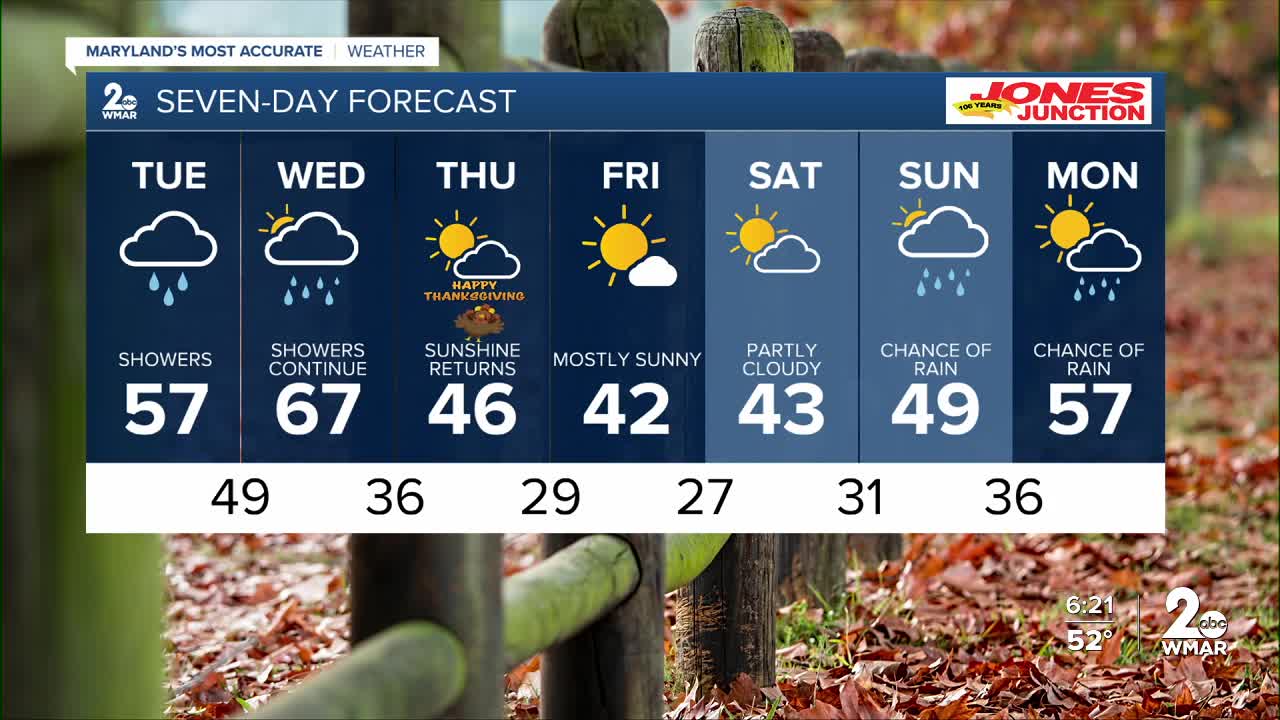 BALTIMORE — Happy Tuesday! Showers are expected to arrive this afternoon and continue into Wednesday. Thanksgiving will be drier and noticeably cooler and windy, with highs in the mid-40s. Winds will be rather blustery later this week, which will make it feel like the low to mid-30s on Thursday and Friday! Winds relax this weekend with dry skies on Saturday. Another front could bring a round of rain showers to the area on Sunday.