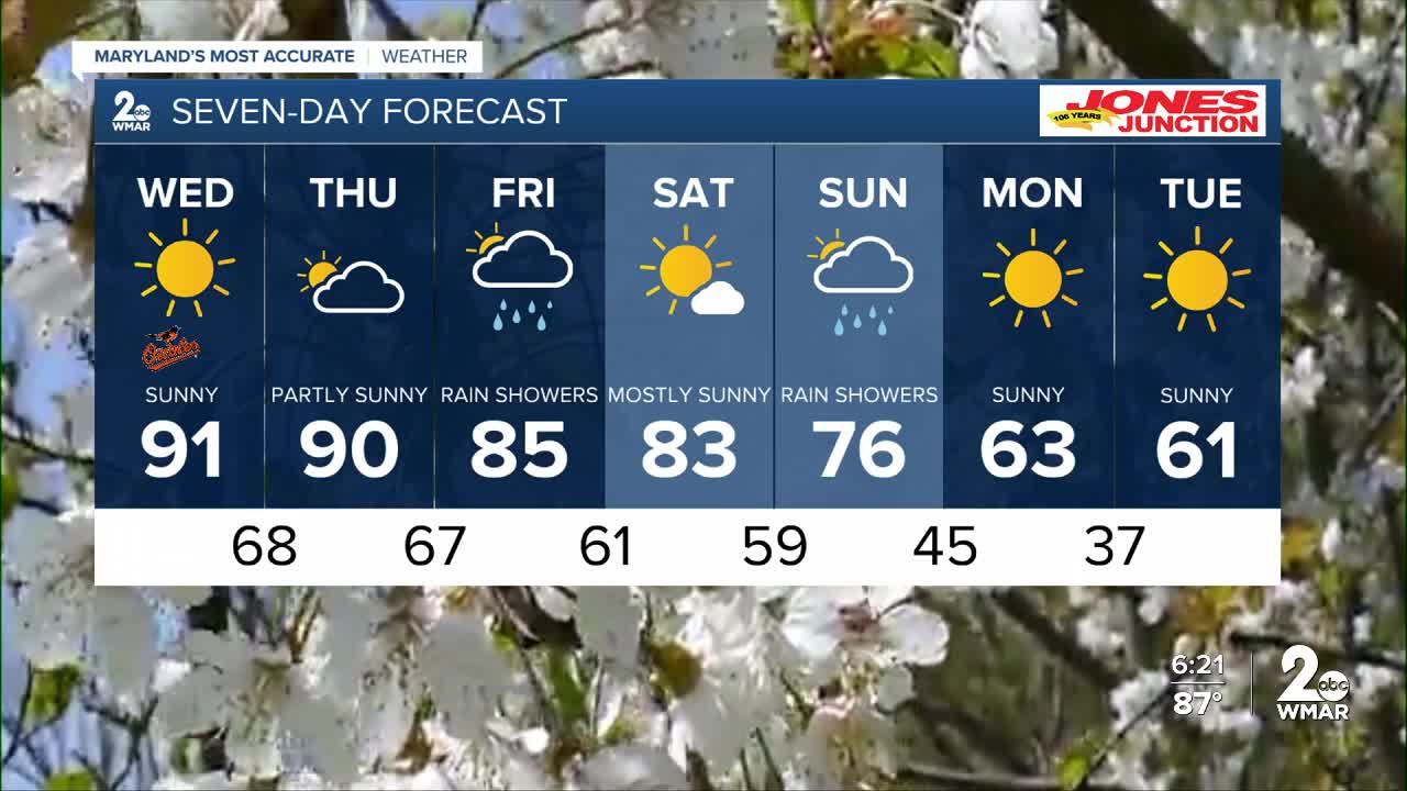 BALTIMORE — Happy Wednesday! Record-breaking temperatures are expected today, with highs rising into the low-90s. Today's old record high of 91° was set back in 1941! Extreme heat builds into the region through Thursday, with highs in the lower 90s. We will likely tie the old record high of 90° set back in 2012 on Thursday! Make sure you stay hydrated and cool! Shower chances increase again on Friday, with another round possible on Sunday.