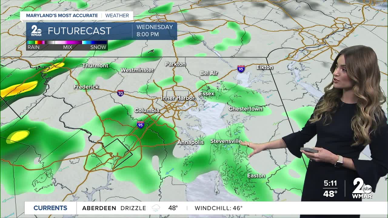 BALTIMORE — Happy Wednesday! Spotty showers work through the area today, with a northeasterly breeze. This will keep temperatures cooler than normal, in the mid to upper-50s once again. Showers become more widespread overnight into Thursday, with some embedded thunderstorms. Rainfall totals will range from 1-2" for most with the heaviest occurring during the Thursday morning commute. The rain tapers off Thursday afternoon, but the winds will increase. Winds will range between 25-40 mph into Friday! The weather will be dry and gusty for Halloween. Winds will relax throughout the weekend and skies will remain dry. Daylight Saving Time comes to an end this weekend, so make sure to turn your clocks back one hour before heading to bed Saturday night.