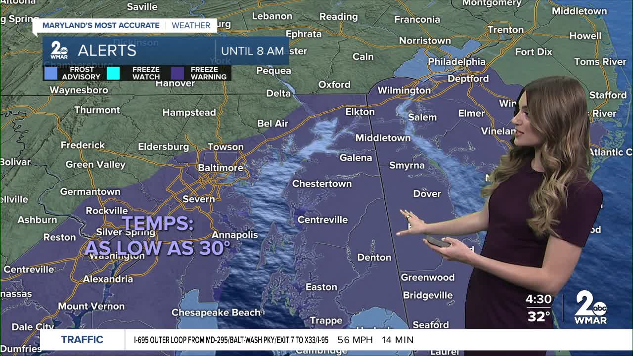 BALTIMORE — Happy Friday! Clouds increase throughout the day with highs in the low to mid-60s, thanks to breezy southerly winds. Showers return to the area this evening as a cold front swings through. Rain chances increase around dinner time and linger through midnight. Saturday will be mostly rain-free with more sunshine and highs in the upper-60s. This will help temperatures climb back near 70°! Another system will be nearby Sunday, with a chance of spotty showers during the afternoon. The bottom line is that Sunday will NOT be a washout. It's important to mention that the high temperature on Sunday will occur early in the day, with much colder air arriving by Sunday afternoon. Temperatures will trend colder than normal early next week, with highs in the 40s!