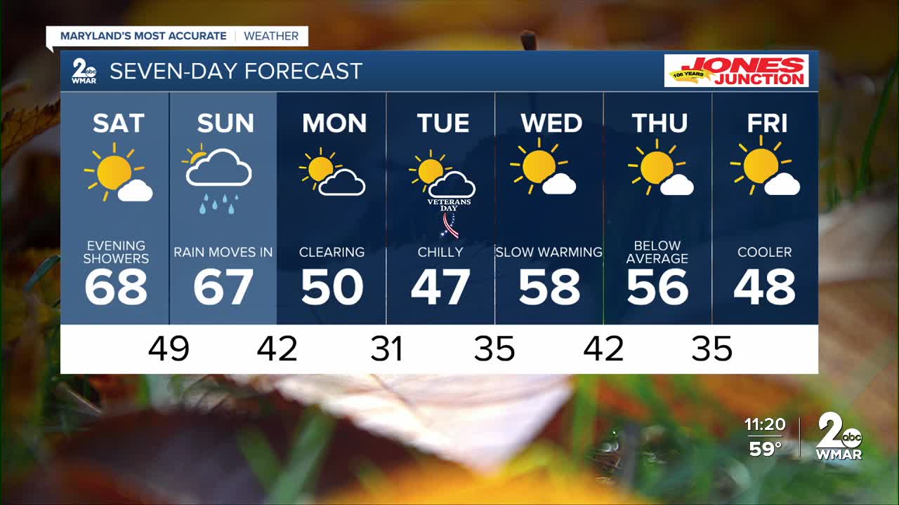 Clouds increase throughout the day with highs in the low to mid-60s, thanks to breezy southerly winds. Showers return to the area this evening as a cold front swings through. Rain chances increase around dinner time and linger through midnight. Saturday will be mostly rain-free with more sunshine and highs in the upper-60s. This will help temperatures climb back near 70°! Another system will be nearby Sunday, with a chance of spotty showers during the afternoon. The bottom line is that Sunday will NOT be a washout. It's important to mention that the high temperature on Sunday will occur early in the day, with much colder air arriving by Sunday afternoon. Temperatures will trend colder than normal early next week, with highs in the 40s!