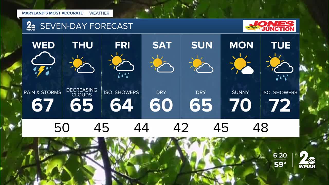 BALTIMORE — Happy Wednesday! Light showers develop later this morning before the bulk of the steady, widespread rain moves in this afternoon/early-evening. The rain wraps up by 9 PM. A slight cool down is expected later this week. Although a freeze is unlikely, there may be areas of patchy frost Saturday night across our northwestern suburbs. A few light sprinkles are possible on Friday afternoon, with drier conditions this weekend.