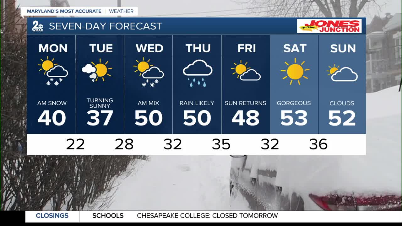 BALTIMORE — Happy Monday! The storm system is tracking farther northeast at a faster speed than expected, which is lowering snowfall accumulations for the area. The heaviest accumulations will still be focused up and down the Eastern Shore. Snow showers will become lighter after midnight through mid-morning. Wet snow is leading to slushy roads, which may make for a difficult morning commute for some. Conditions clear out by noon with some breaks of sunshine later today. High temperatures will rise into the upper-30s, paired with brisk northwest winds.