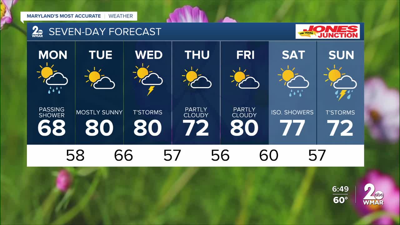 BALTIMORE — Happy Monday! Temperatures will rise near 70° today with a few spotty showers. Warming up near 80° on Tuesday under mostly sunny skies. The weather pattern turns more unsettled mid-week as showers and a few gusty thunderstorms are possible on Wednesday. Thursday and Friday look drier, before more widespread rain chances return heading into the weekend.