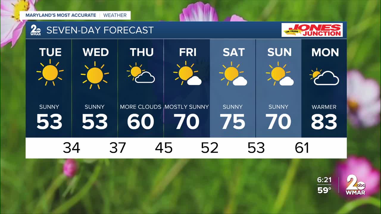 BALTIMORE — Happy Tuesday! A chilly and breezy day with abundant sunshine! High temperatures will remain below average, in the mid-50s this afternoon, thanks to a northwest breeze. Freeze Warnings go into effect for the entire area from midnight through 9 AM Wednesday as temperatures will fall below freezing! Cover up the sensitive plants! Sunny skies through the rest of the week with temperatures climbing back into the 70s by Friday! Warming up this weekend with ample sunshine! The 80s make a comeback next week!