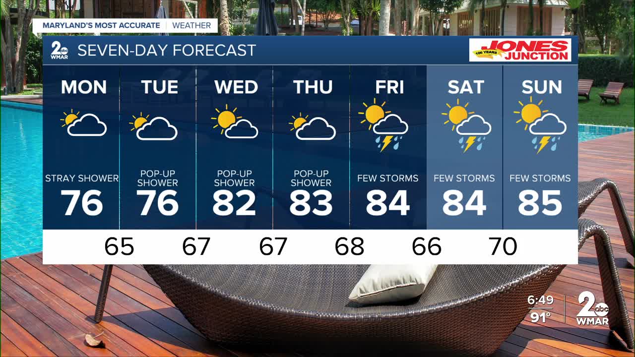 The shower threat will shift to southern Maryland Monday and Tuesday, with a stray shower to the north.