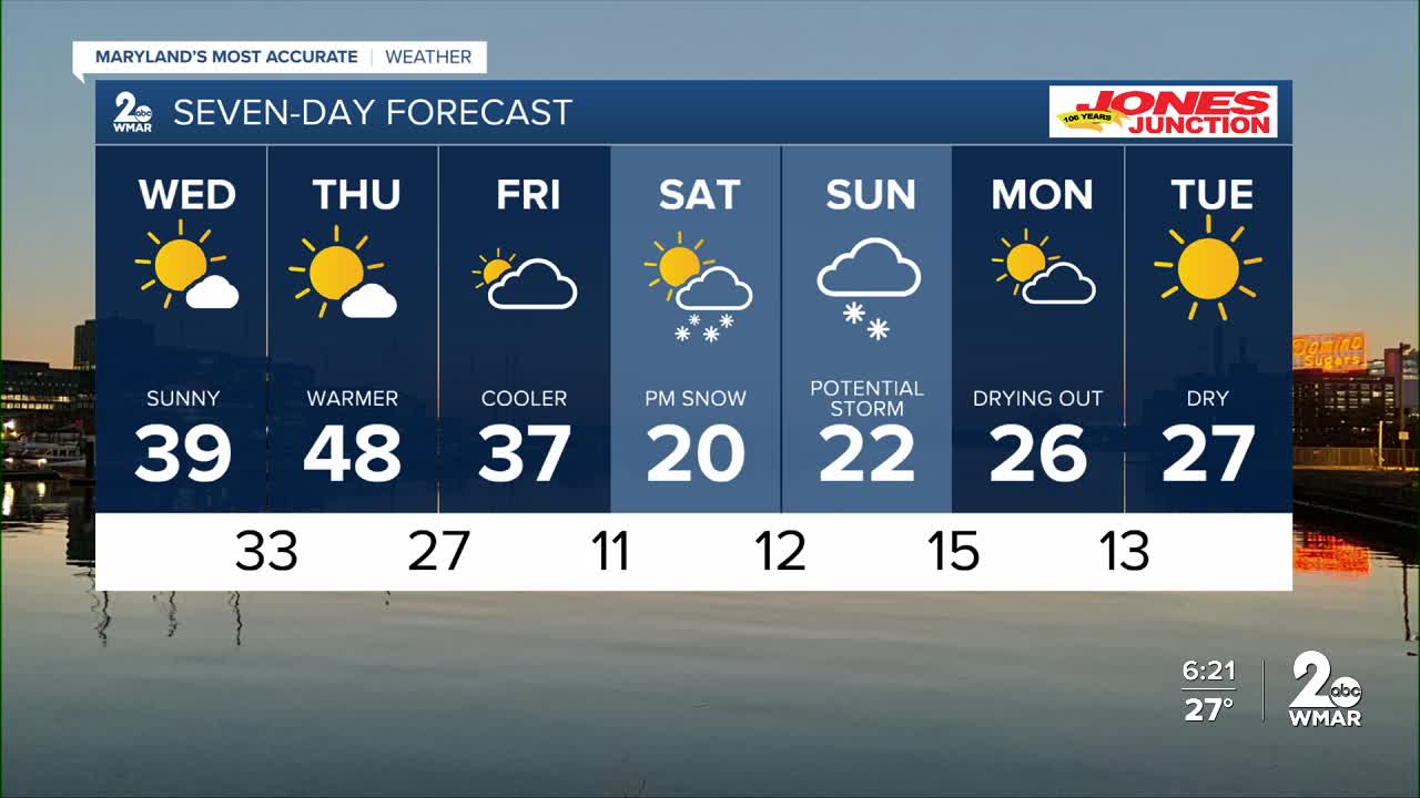 BALTIMORE — Happy Wednesday! Mostly sunny today with highs in the upper-30s. Clouds begin to increase later this week as we track our next potential major snowstorm heading into the weekend. The exact track of the storm remains uncertain, and that will ultimately determine snowfall amounts. At this time, models hint at the snow arriving Saturday evening with the heaviest snow expected to fall on Sunday. Snowfall totals are still uncertain, but there is a high confidence of seeing several inches of snow and possibly some ice. This will pose significant travel risks this weekend if everything comes together.