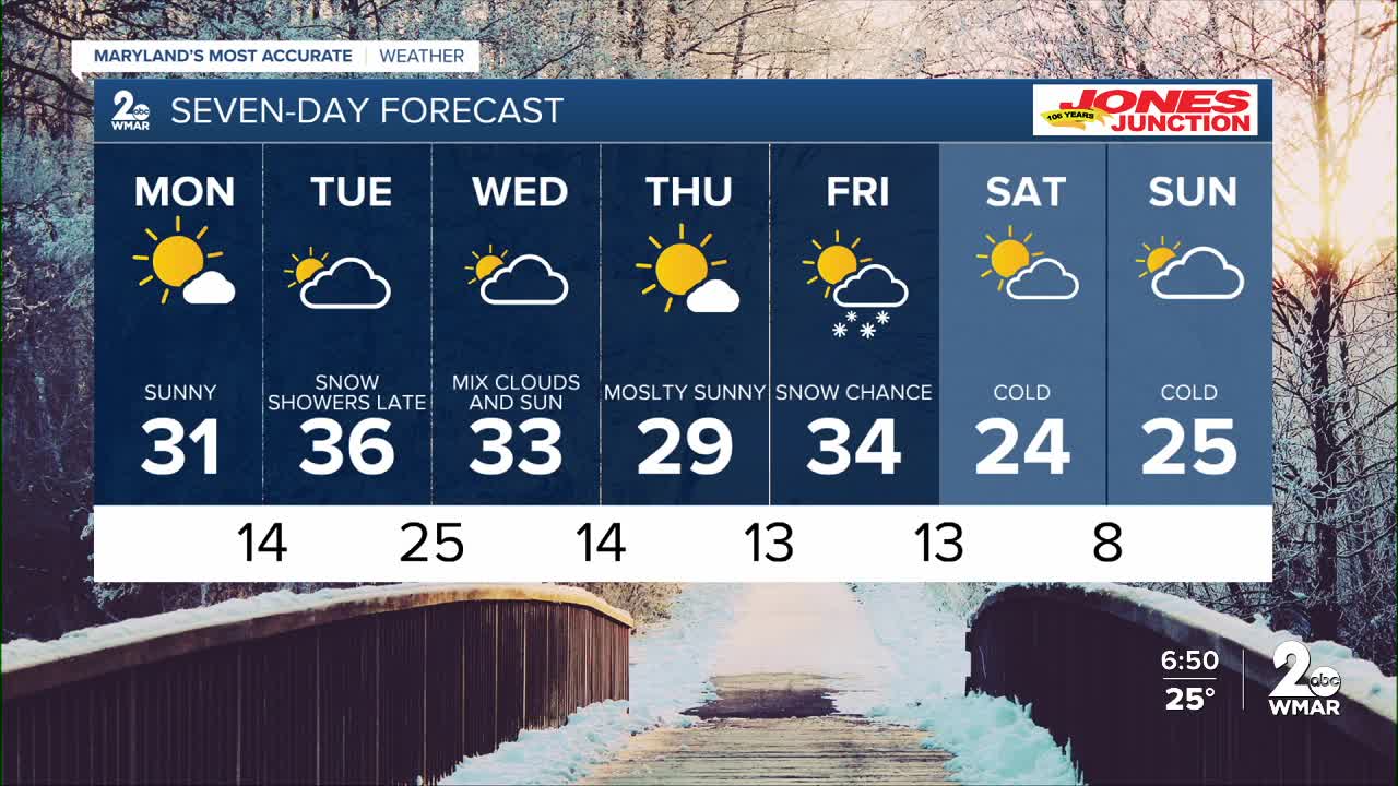 BALTIMORE — Happy Monday! Today will be bright and sunny with temperatures rising to the freezing mark! We will finally climb above freezing on Tuesday. There is a chance for light snow showers on Tuesday evening, however, it will be just enough to produce a dusting to a half inch of snow accumulation. Another disturbance moves through on Friday, which could bring another round of light snow to the area. Turning blustery and bitterly cold this weekend.
