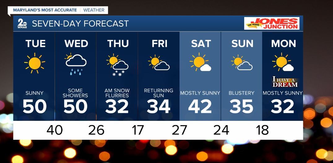 All good things on the weather side of the forecast for your second day. Conditions start off relatively clear with mild winds ramping up this afternoon. Highs today are expected at or near 50 degrees. We note a change tonight, with incoming cloud cover and slight chances for rain. Pushing past midweek, we see a batch of very cold air that will drop overnight temperatures into the teens and single digits. We will see cooler temperatures into the weekend.