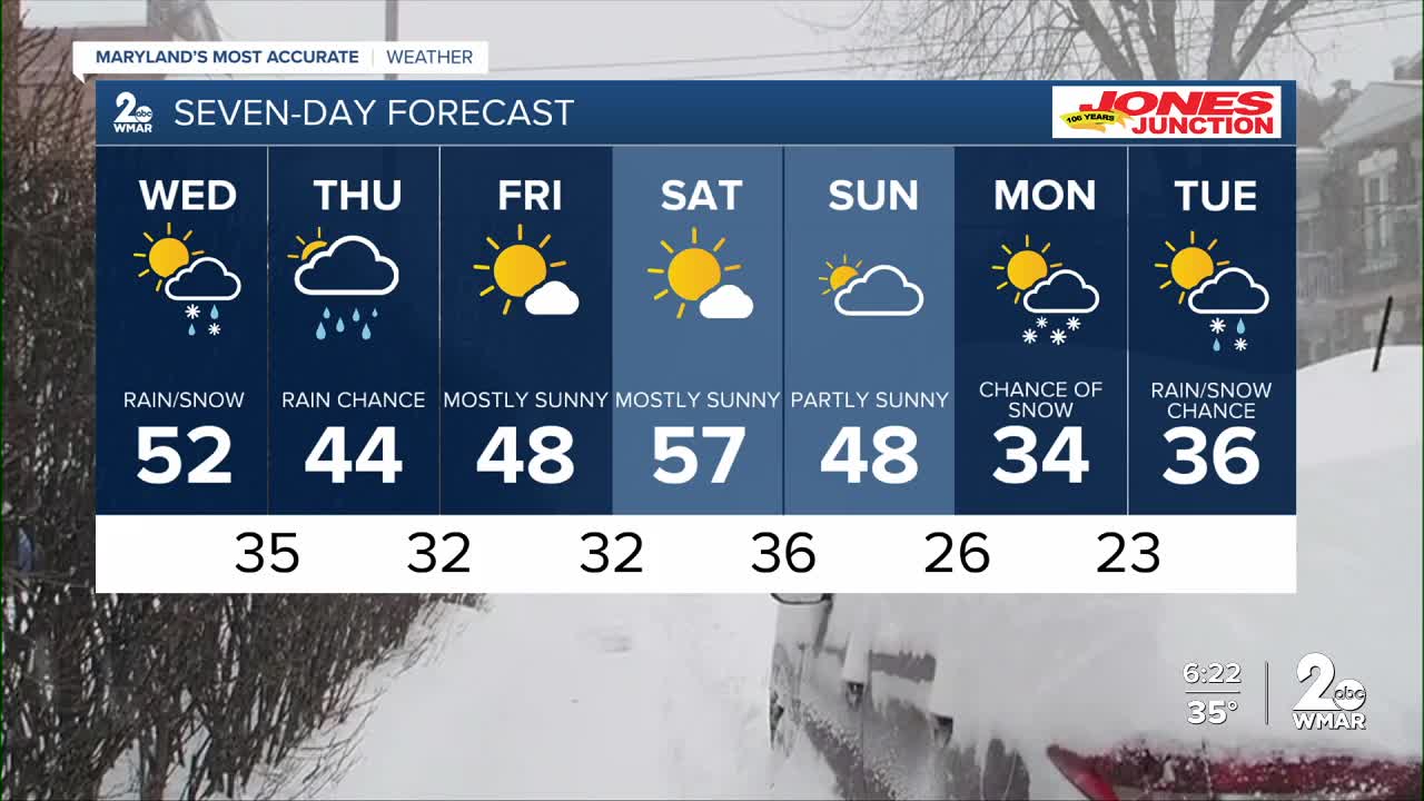 BALTIMORE — Happy Wednesday! Early rain showers and light snow lingers through late-morning with more sunshine to follow this afternoon. High temperatures will rise into the low-50s today, thanks to southerly winds! This will help melt some of the leftover snowpack on the ground. A storm system on Thursday looks to bring mostly rain showers to the area, especially around our southern communities. Depending on timing and temperature profiles, some flakes may mix in near the MD/Pa line. The weekend looks bright and beautiful with highs in the 40s and 50s! There are signs of wintry weather early next week.