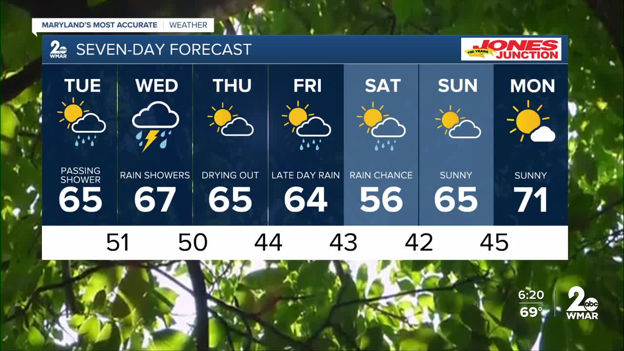 BALTIMORE — Happy Tuesday! A weak front brings a few sprinkles from late morning into early afternoon. A stronger and more potent storm system moves in Wednesday, bringing rain, wind, and a couple of thunderstorms. Expected rainfall amounts between 0.50-1" with rain and storms kicking off around lunchtime and lingering through sunset. Cooler air settles in late-week and into the weekend.