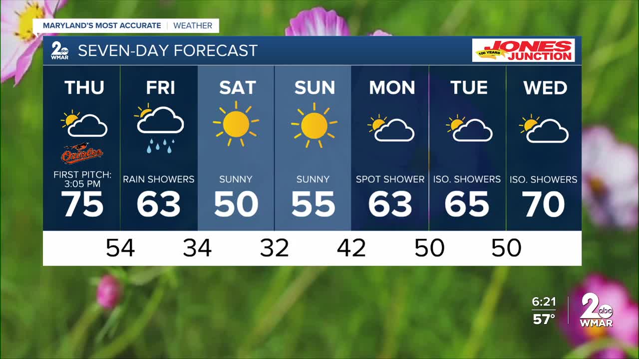 BALTIMORE — Happy Thursday! Warm weather for the O's home opener! Much of the day will be dry with high temperatures in the low to mid-70s! Dress cool if you're heading to the ball park! The bulk of the rain holds off until late tonight and will linger throughout Friday. A few thunderstorms are possible as well. Sunny skies and cooler temperatures are expected this weekend! Milder with increasing rain chances next week!