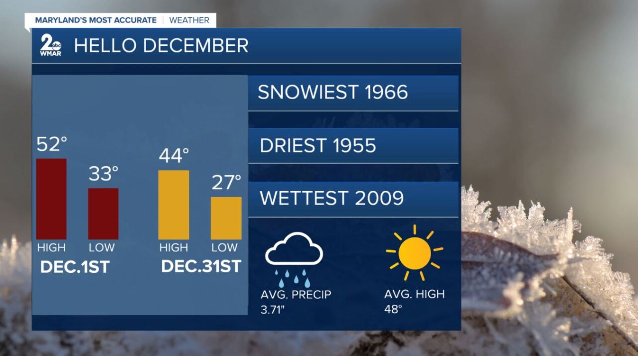 - The first day of December is typically in the lower 50s and a daytime low of 33 degrees.