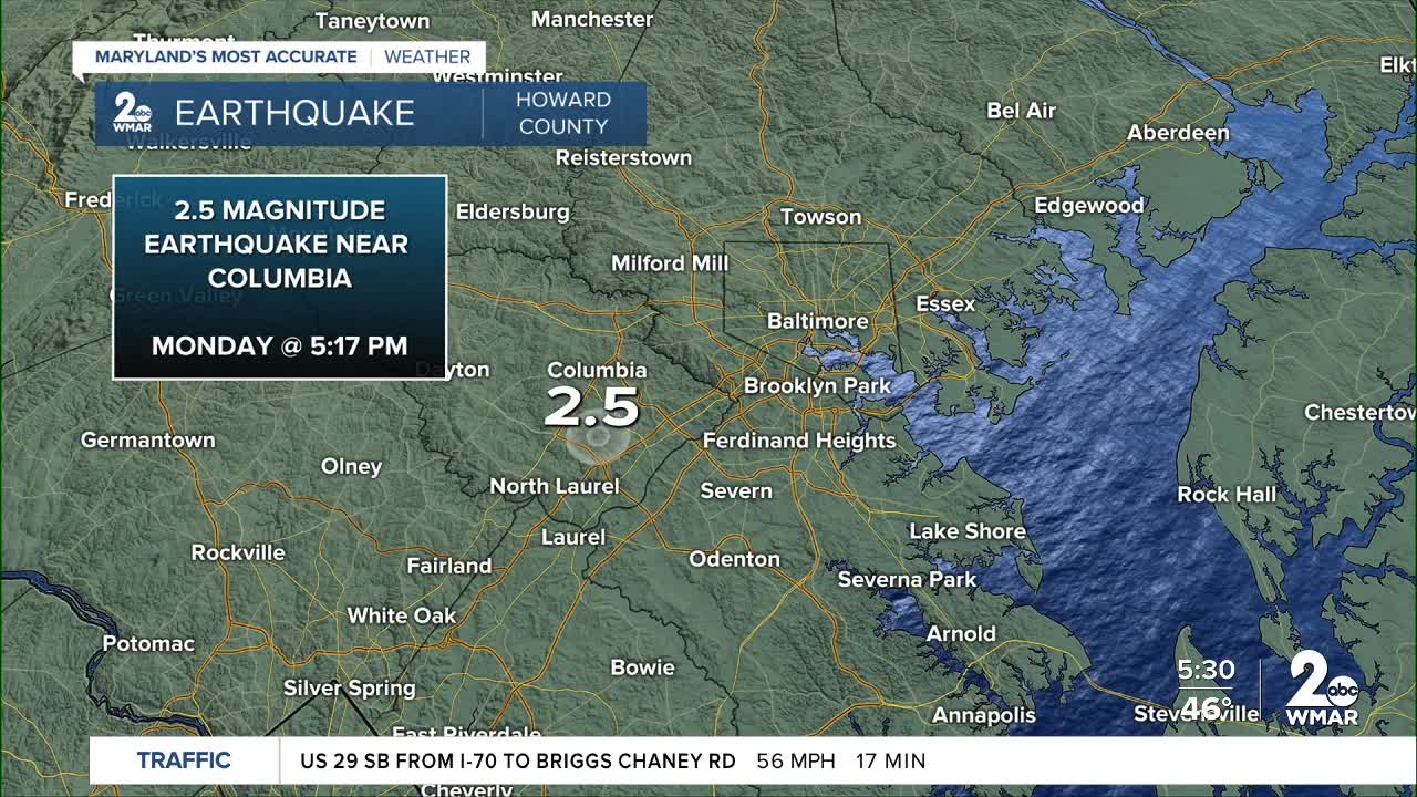 HOWARD COUNTY — Did you feel it? According to the U.S. Geological Survey (USGS), a small 2.5 magnitude earthquake occurred on Monday evening shortly before 6 PM in Howard county, about 2 miles from Columbia near Riverside. Typically, an earthquake of this magnitude is generally not felt and causes little to no damage. You're more likely to notice the tremor if you are in a quiet environment. Brief light shaking or a sharp jolt can still be felt, depending on your activity and proximity to the epicenter. The epicenter is the spot on Earth's surface directly above where the earthquake rupture took place. The closer you are to the epicenter, the more likely you are to feel it!